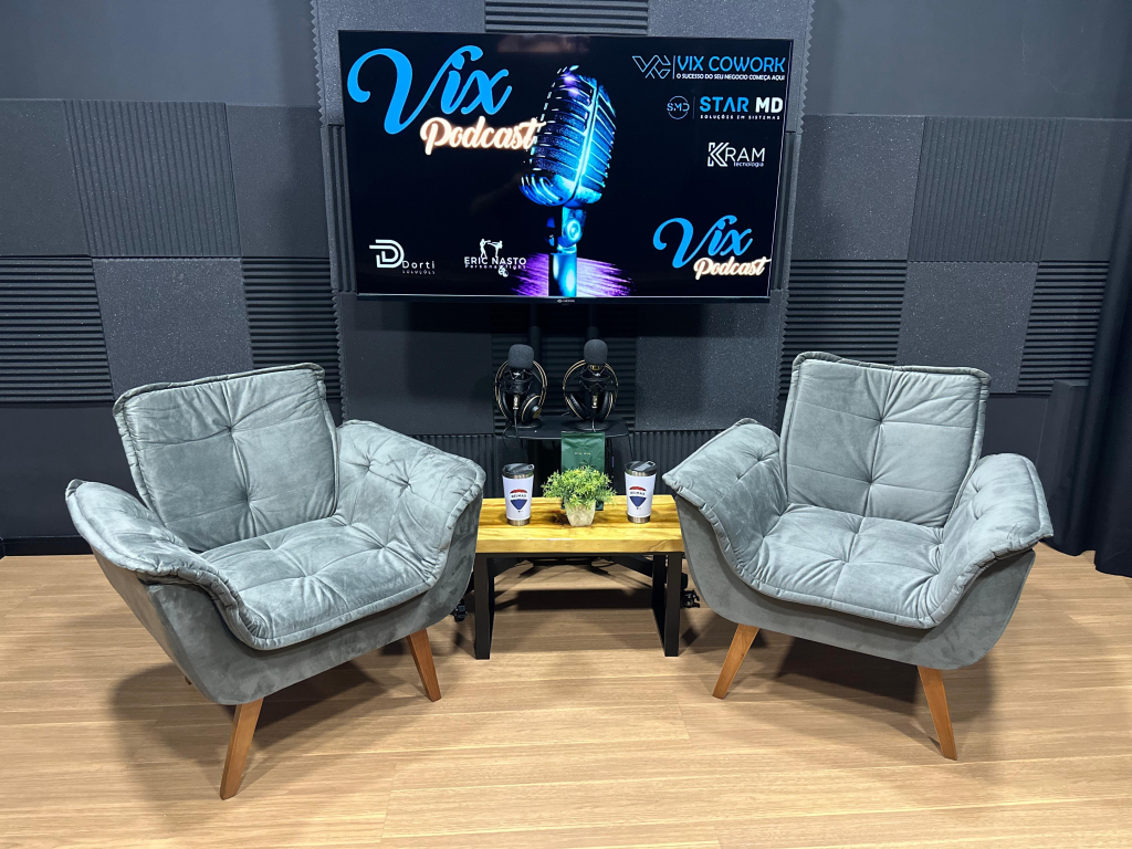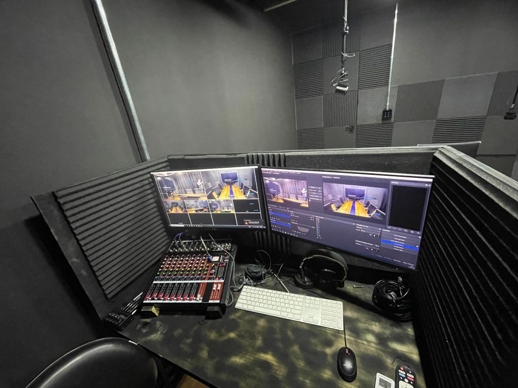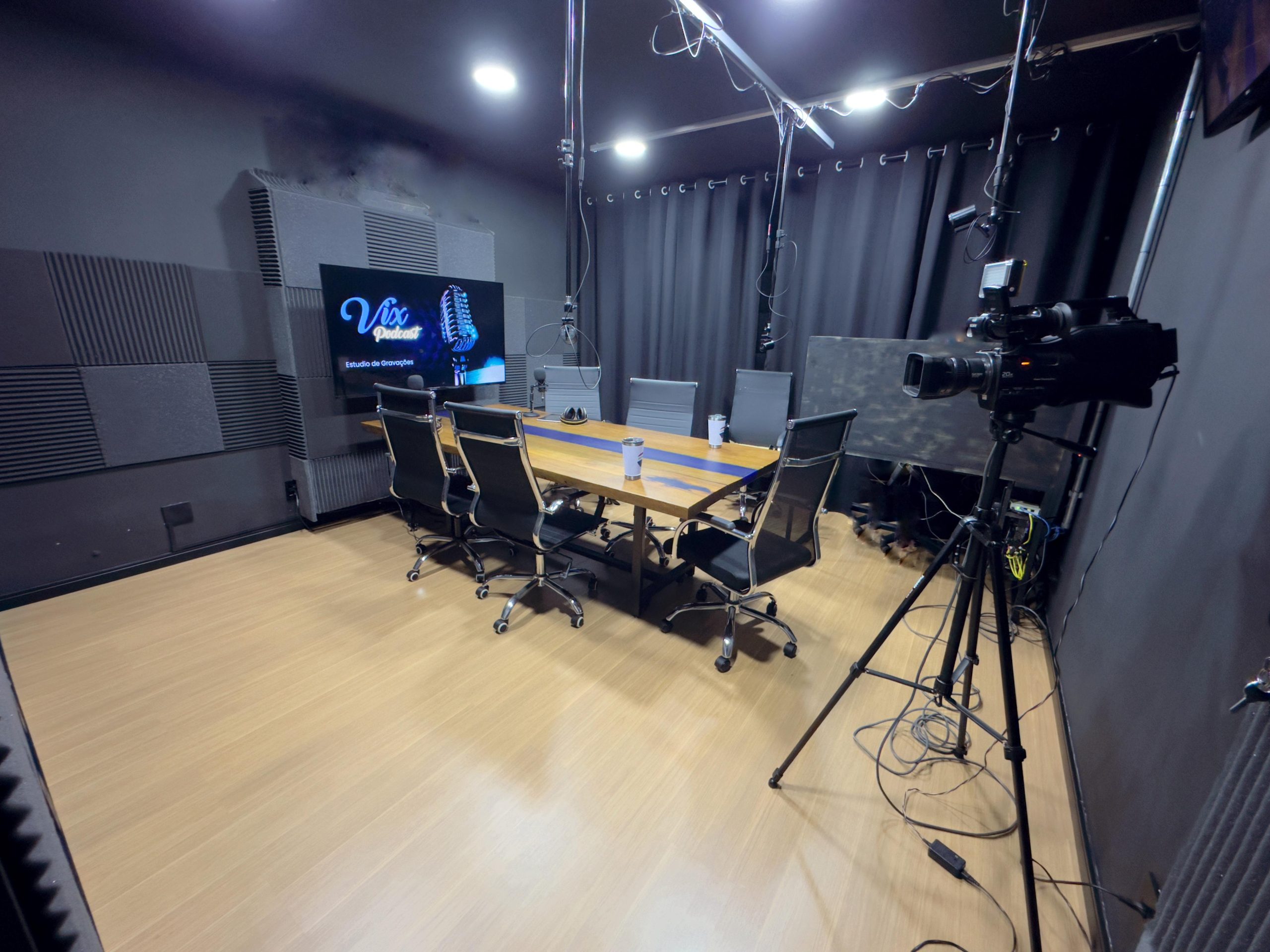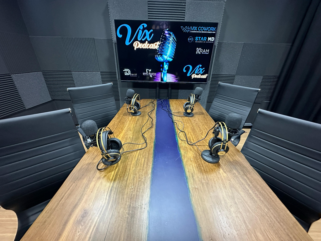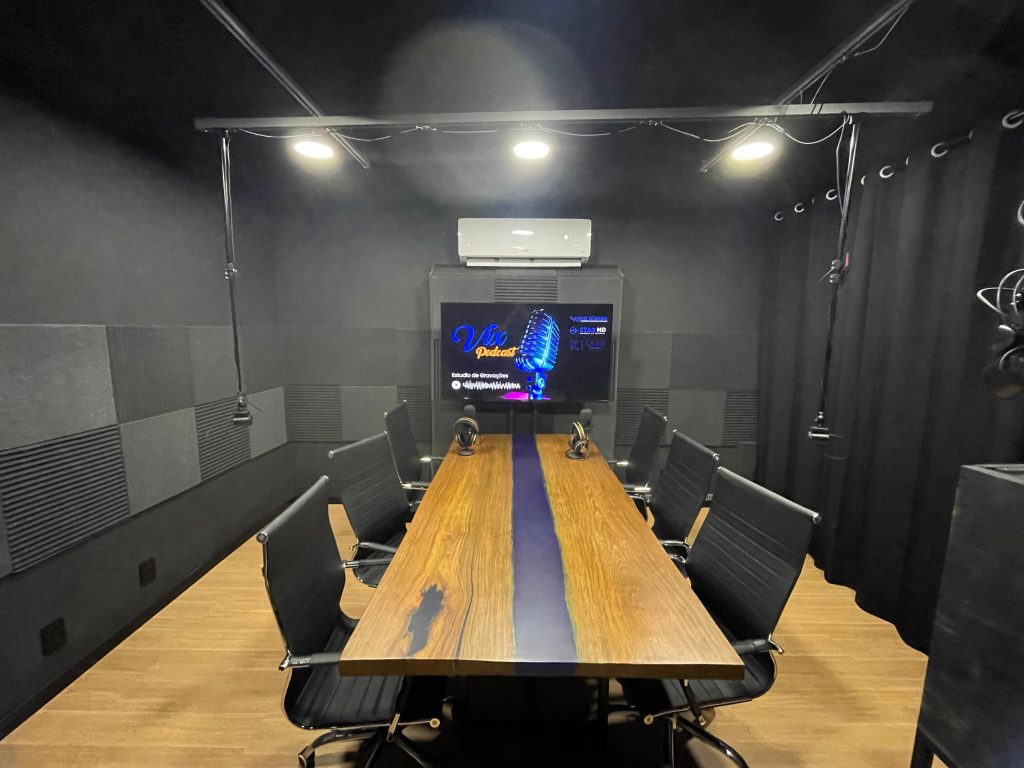 Mesa com capacidade 06(seis) pessoas, 06(seis) microfones e 06(seis) phones de ouvidos